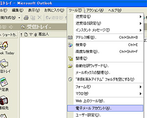 | 1. MicrosoftOutlookを起動して、メニューバーの[ツール]から[電子メールアカウント]を選択します。 | |||