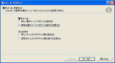 2. [電子メールアカウント]画面が表示されますので、[既存の電子メールアカウントの表示と変更]を選択して、[次へ]ボタンをクリックします。 |